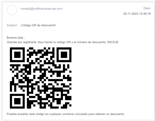 - Recepción: ¡Busca el correo! Recibirás un email con el asunto “¡Código QR de descuento!“ (como el ejemplo donde sale el código IMCDJE y la cantidad restante). Tu código también estará en tu perfil de la página web.